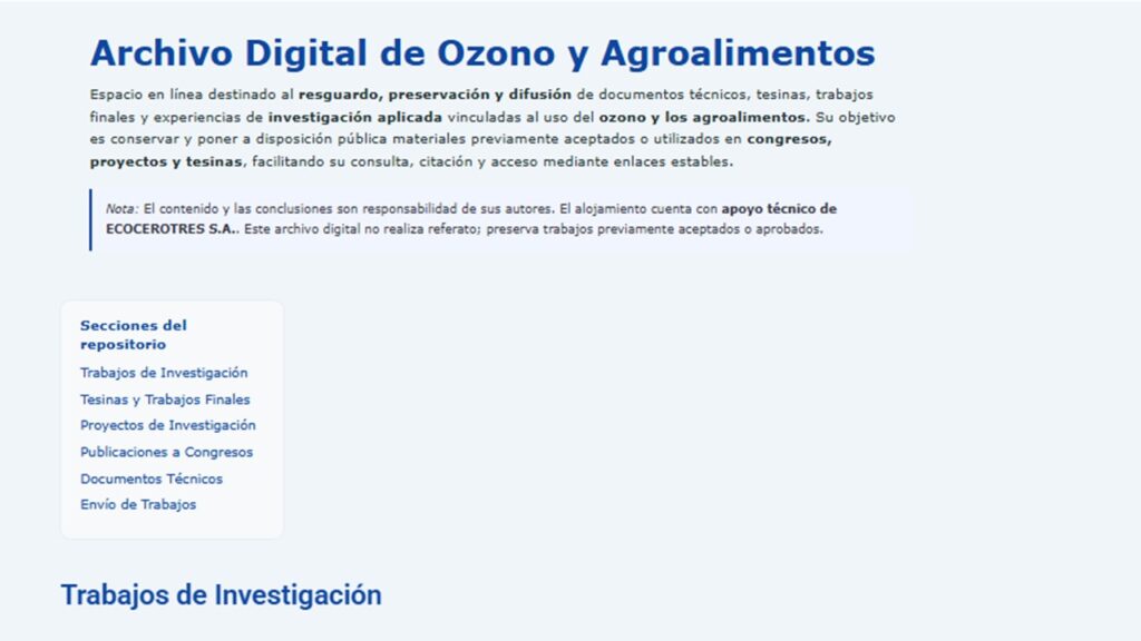 Archivo Digital de Ozono y Agroalimentos Espacio en línea para el resguardo y difusión de documentos técnicos, tesinas y experiencias de investigación aplicada sobre el uso del ozono en agroalimentos, con acceso público y enlaces estables.